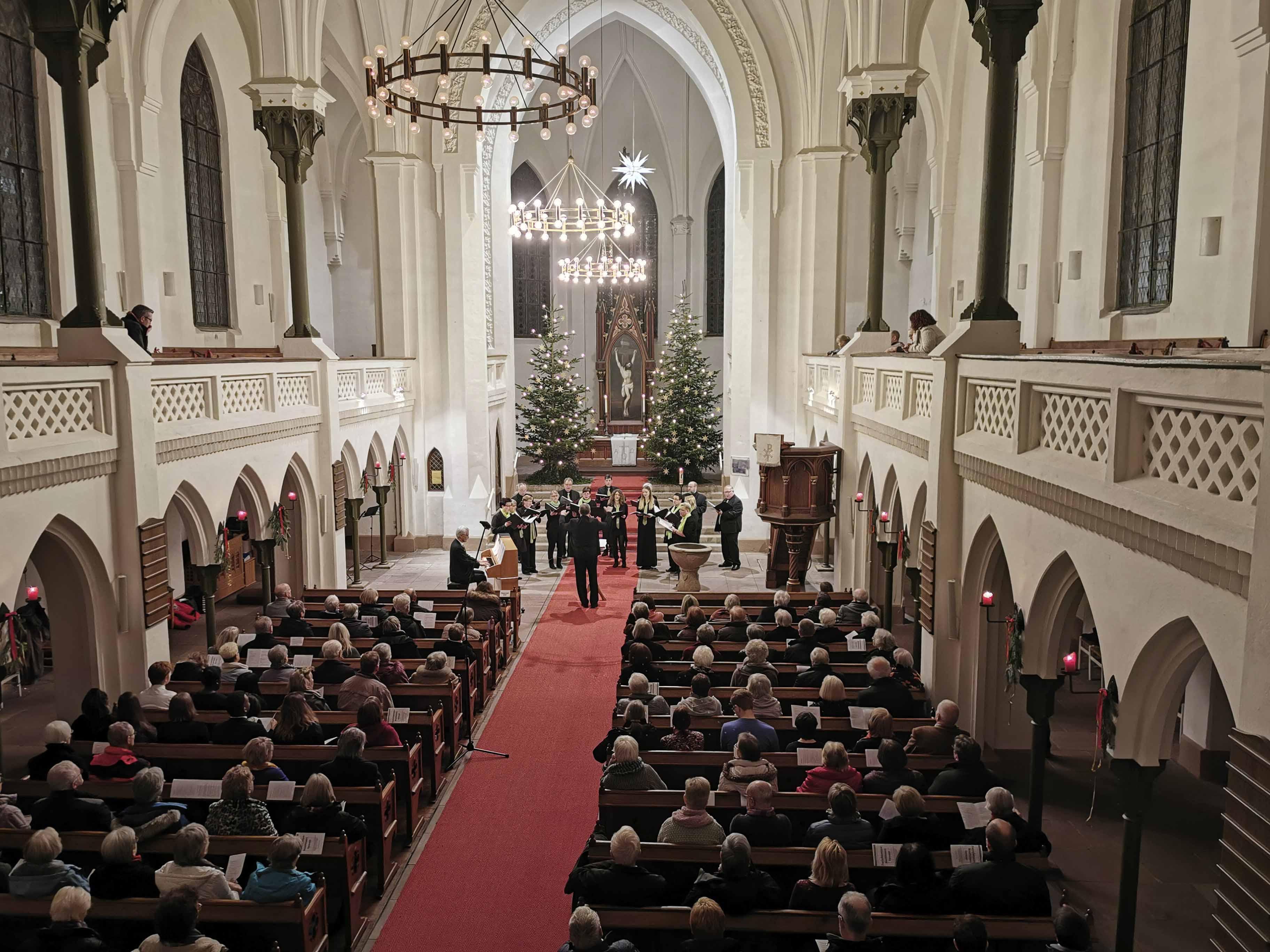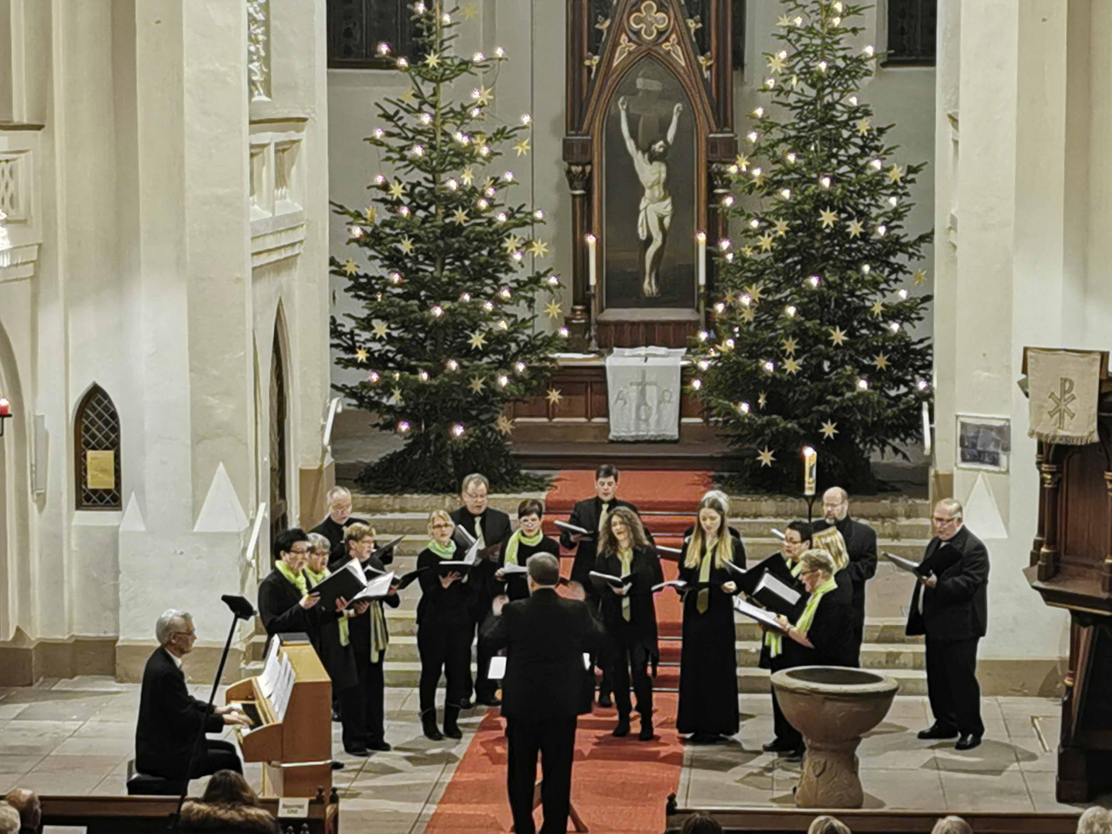 Zum 250. Geburtstag von Ludwig van Beethoven eröffnete »DER KLEINE CHOR HAMBURG« das Konzert mit einer Auswahl dreier Stücke des bekannten deutschen Komponisten und Pianisten: »Gott ist mein Lied«, »Die Himmel rühmen« und »Gott, deine Güte reicht so weit« basieren auf Musik aus der Feder van Beethovens. Die 16 Sängerinnen und Sänger präsentierten 14 weitere internationale Chormusikstücke, die von der Klassik bis in die Moderne reichten. Dabei thematisierten sie unter anderem das kürzlich gefeierte Weihnachtsfest sowie Frieden und Segen für das Jahr 2020. Drei deutschsprachige Einlagen des Männergesangvereins Nottensdorf ergänzten das Konzert. Geleitet wurden beide Chöre von Chorleiter René Clair.